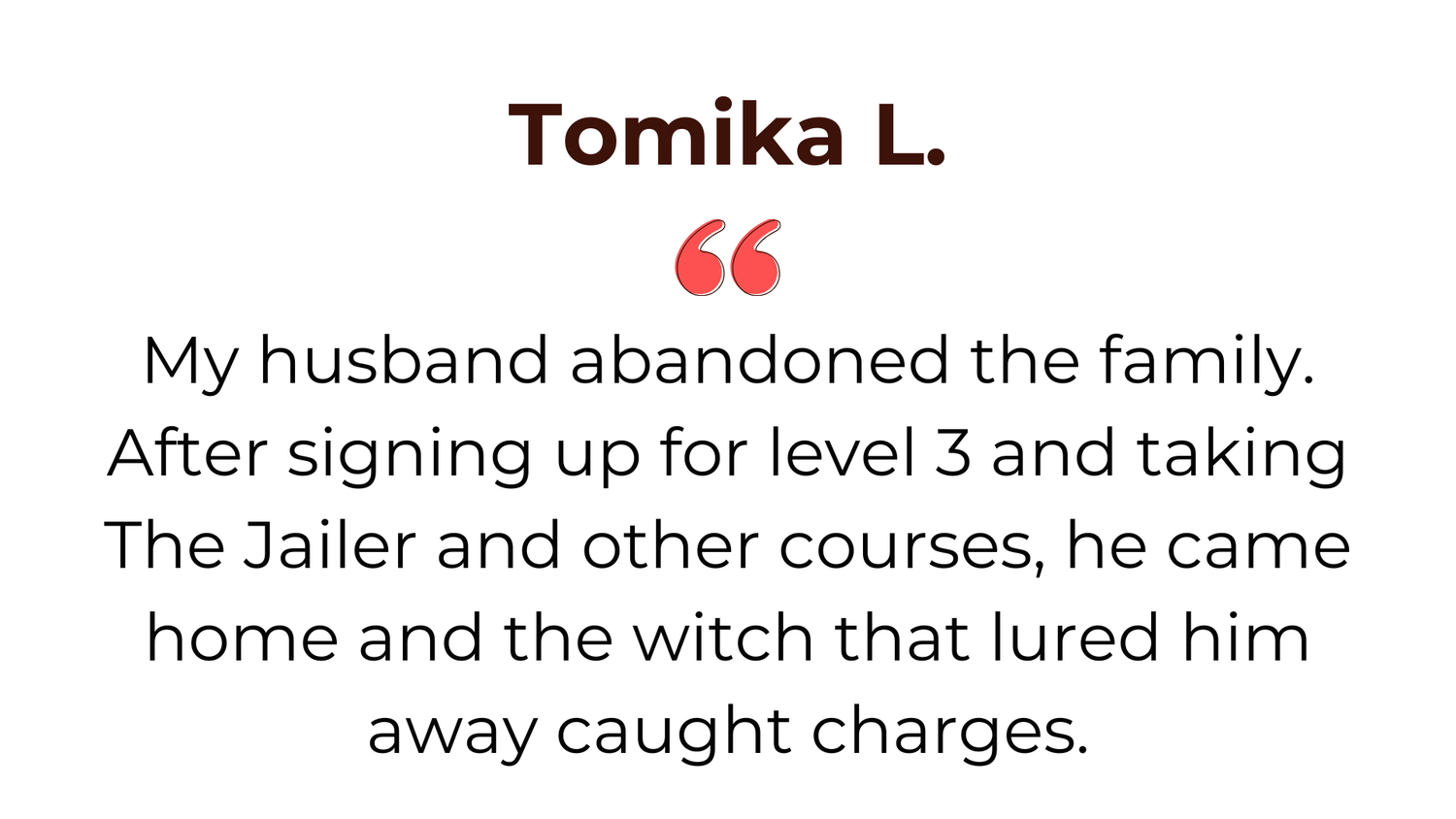 My husband abandoned the family. After signing up for level 3 and taking 'The Jailer' and other courses, he came home and the witch that lured him away caught charges.
