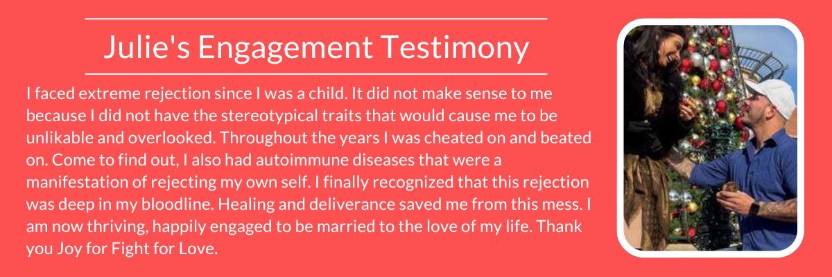 I faced extreme rejection since I was a child. It did not make sense to me. Throughout the years I was unliked, overlooked, cheated on and beat on. Come to find out, I also had autoimmune diseases that were a manifestation of rejecting my own self. Healing and deliverance saved me from this mess. I am now thriving, happily engaged to be married to the love of my life. Thank you Joy for Fight for Love.